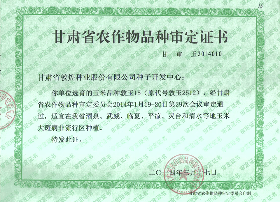 敦玉15品種審定證書(國家)